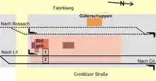 Creidlitz station is located on the south side of the town of Coburg on the Werra Railway at kilometre stone 134.77 between Coburg station and the halt at Grub am Forst. Despite having two platforms and being described as a Bahnhof, it is not particularly important nowadays, only the Regionalbahn trains to Coburg and those in the opposite direction to Lichtenfels stop here. The trains to Lichtenfels leave from the eastern 'home platform, number 1, and trains to Coburg from platform 2, an island platform with no subway. The red brick station building was built at the end of the 19th century. Due to its age, it is one of the most important station buildings in the Coburg district and is a listed building.[1] During the construction of the Itz Valley Railway to Rossach in 1900 the station, which is located between branching tracks, was built with two platforms in 1911; whene the second line to Coburg was built it was expanded by a further platform. On the eastern side are the two tracks of the Werra railway and on the western side, the Itzgrund railway track and a second, parallel, track for the goods shed. In 1950 the station, including the Rossach branch, was electrified. In 2004 the Rossach branch was closed. Because the section of line to Lichtenfels is single-tracked, trains often cross at the station. In 2008 the station still had semaphore signals and manually operated level crossing barriers. Next to the station is a bus stop with the same name - Creidlitz/Bahnhof - which is served by one of the town bus lines as well as busses of the OVF.