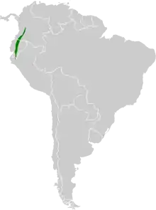 The nominate subspecies of rainbow-bearded thornbill is found from the Western Andes of Colombia in Cauca Department through Ecuador on both slopes of the Andes into northern Peru's departments of Piura and Cajamarca. C. h. tolimae is restricted to Nevado del Tolima in Colombia's Central Andes. A bird of high elevations, it is typically found between 2,700 and 4,100 m (8,900 and 13,500 ft) in Colombia and 2,800 and 3,700 m (9,200 and 12,100 ft) in Ecuador. Its primary habitat is paramo, open country with bushy patches and small woodlands, and gulleys with thickets of ferns and bromeliads.[9][12][11][10]