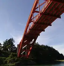 This is a deck arch bridge made of steel, built in 1957, with a total length of 242.90 metres (796.9 ft) and a main span of 176.80 metres (580.1 ft).[1] There is 75 feet (23 m) of clearance below the bridge, above Swinomish Clannel[2]