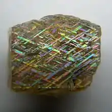 Rainbow lattice sunstone, also known as Rainbow lattice, is a type of orthoclase feldspar that exhibits a rare combination of aventurescence, adularescence and a distinctive iridescence lattice pattern. The iridescence lattice pattern consists of inclusions that are the result of crystallographically oriented exsolution crystals within the feldspar crystal. Sunstone refers to its physical appearance instead of its chemical composition.[1][2]