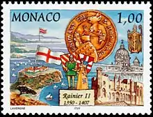 Rainier II, Lord of Monaco (1350–1407), was the monarch of Monaco from June 29, 1352 to August 15, 1357.[1] He was the son of Charles I, Lord of Monaco, and Lucchina Spinola. He ruled jointly with his father Charles I, Lord of Monaco, his father's uncle Antonio, Lord of Monaco and his brother Gabriele, Lord of Monaco. He yielded Monaco to the besieging Genoese for 20,000 fl. but retained Menton and Roquebrune.