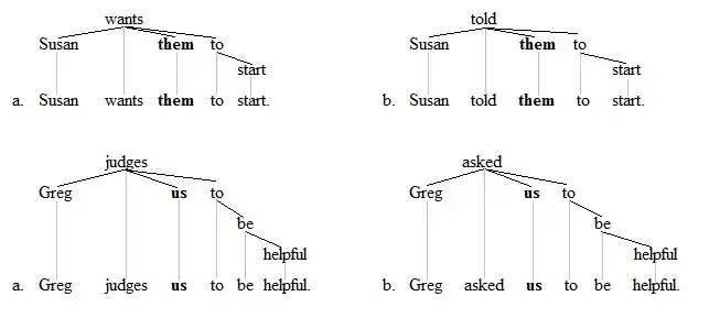 The a-trees contain the raising predicates wants and judges, whereas the b-trees contain the control predicates told and asked. Despite the fact that structures assumed for these different predicate types are essentially the same, there is a major distinction to be drawn. This distinction is that the control predicates semantically select their objects, whereas the raising predicates do not. In other words, the object is a semantic argument of the control predicate in each case, whereas it is not an argument of the raising predicate. This situation obtains despite the fact that both predicate types take the object to be the "subject" of the lower predicate.