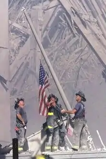 Raising the Flag at Ground Zero is a photograph by Thomas E. Franklin of The Record newspaper of Bergen County, New Jersey, taken on September 11, 2001. The picture shows three New York City firefighters raising the U.S. flag at Ground Zero of the World Trade Center, following the September 11 attacks. The official names for the photograph used by The Record are Firefighters Raising Flag and Firemen Raising the Flag at Ground Zero.[1] The photo appeared on The Record front page on September 12, 2001. The paper also put it on the Associated Press wire and it appeared on the covers of several newspapers around the world. It has often been compared to the Raising the Flag on Iwo Jima photograph taken by Joe Rosenthal during World War II.[2]
