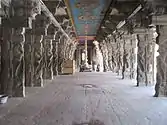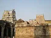 The originally temple was first constructed by Kulothunga Chola I(1070-1125 A.D.) stone inscription found in the site.[6] The place Mannargudi is termed Sri Rajathi Raja Chathurvedhi Mangalam[7] and the town started to grow around the temple. Successive kings of the Chola empire, Rajaraja Chola III, Rajendra Chola III and kings of Thanjavur Nayaks, Achyuta Deva Raya[8] expanded the temple. The temple contains inscriptions of the Hoysala kings and some Vijayanagara grants, and many records of the later Nayaks and Marathas.[9] The Thanjavur Nayaks made the temple as their dynastic and primary shrine and made significant additions.[10] The current temple structure, hall of 1000 pillars, main gopuram (temple gateway tower) and the big compound wall around the temple was built by the king Vijayaraghava Nayak(1532-1575 A.D.).[6] Raghunathabhyudayam, a doctrine by Nayaks explains the donation of an armour studded with precious stones to the main deity by the king.[8] He erected the big tower in the temple so that he can view the Srirangam Ranganathaswamy temple from the top of Mannargudi. The Nayaks were specially interested in music and it was promoted in both the temples. Instruments like Mukhavina, Dande, Kombu, Chandravalaya, Bheri and Nadhaswaram were commonly used in the temple service.[11]