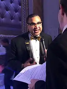 His regional credits include: New Freedom Theatre (Mother Emanuel, An America Musical Play[14][15][16] The Ballad of Trayvon Martin,[17][18][19] Jamaica,[20][21][22][23] Don't Bother Me, I Can't Cope (Barrymore Recommended),[24][25][26][27][28] The Black Nativity[29][30][31] and Walk Through Time, by Pulitzer Prize Recipient - Lynn Nottage - World Premiere), Passage Theatre (Little Rock - 2015 Barrymore Award - Outstanding Ensemble in a Play,.[32]