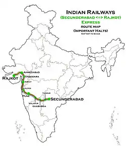 The Rajkot–Secunderabad Express is a popular train in the South Central Railway zone of the Indian Railways. It is only one of three trains connecting Hyderabad with Rajkot in the state of Gujarat, the other two being the Bhavnagar Terminus–Kakinada Port Express and the Rameswaram–Okha Express. The train was introduced in the year 1985 to run from Ahmedabad to Hyderabad as a weekly super-fast train. But, due to the increasing rush of passengers the train was made bi-weekly in June 2001[1] and tri-weekly in April 2003.[2][3]The train was later extended to Rajkot and was degraded to Express status as the number of stops were increased.