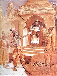 In the meanwhile, King Janaka arranges a swayamvara ceremony for his daughter Sita. A swayamvara ceremony is a Vedic ritual in which a prospective bride selects her groom from among a group of suitors who attend the ceremony. Sita falls in love with Rama at first sight in Janaka's garden and prays to Parvati that she may get Rama as her husband. King Janaka sends a messenger to invite Rama, Laksman and Sage Vishvamitra to attend the swayamvara. Janaka puts a condition to identify the right groom for Sita. The great bow of Shiva by the name of Pinaka was kept in the arena. Any suitor who would be able to string Pinaka would be married to Sita. Many princes try but fail to even nudge the mammoth bow. This causes great distress to Janaka who wonders aloud if the earth has become devoid of brave men. This statement of Janaka angers Lakshman who retorts that no one talks in this vein, when a gathering like this, has the presence of scions of the Sun Dynasty. Rama gently nudges him to keep calm as Vishwamitra asks him to break the bow and make Janaka happy once again. Rama steps in and effortlessly lifts and strings the divine bow. In a swift move, he breaks the bow. The breaking of Pinaka causes a great noise that disturbs the great sage Parashurama in his meditation and he storms into the swayamvara arena in great anger vowing to kill whoever had dared to break the bow of lord Shiva. Lakshman enters into an argument with Parashurama, paying scant respect to the sage who was known for his bursts of anger and was known to slay whoever dared to oppose him. Ultimately, Rama brings him around. Parashurama comes to know the real nature of Lord Rama as the ultimate Brahman, pays his respects and leaves for the forests for meditation. Sita places the wreath of victory around the neck of Rama in accordance with the rules of the swayamvara and is thus wedded to him.