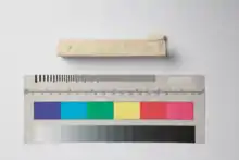 Magic wand #1795 H 12 cm, L 2.5 cm, W 2.7 cm. This piece was a part of an ivory rod. It has two recumbent lions carved on each side. The top part of the rod is lost. Magic rods consist of individual segments that are joined by dowels.[7] There are other examples from the Middle Kingdom of Egypt, where the rods are made of steatite.[8]
