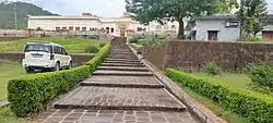 The ancient fort is square with polygonal bastions to support its four corners. The fortifications wall and the bastions rise to three storeys and are crowned with battlements and merinos. Around the central courtyard inside Ramnagar Fort, there are cells and vaulted chambers where cannonballs are stored. There are images of Ganesa, Durga, and Hanuman in the gateway. The fort is surrounded by a moat and access to it is gained through a narrow bridge on the southeastern side.[2][3]