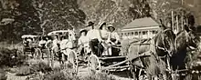 Following the 1855 Public Land Commission ruling, squatters began settling in the Temescal Valley to establish title to land there under the Preemption Act of 1841. In 1857, the Temescal Station of the Butterfield Overland Mail stage line was established five miles north of the Temescal Hot Springs, ten miles north of Rancho La Laguna station and twenty miles south of the Chino Rancho station. The Temescal Overland station was "at the foot of the Temescal hills, a splendid place to camp, wood and water plenty, and protected from the winds."[10] Temescal had its own post office from Feb 12, 1861 to Nov 12, 1861.[11] Around this location the settlement of Temescal grew over the next few decades. By 1860, Greenwade's Place at Temescal, 3 miles north of the stage station, was a polling place for southwestern San Bernardino County. Voting irregularities there that year, resulted in a court case between the candidates for a California State Assembly seat. The trial was so contentious it included the shooting of Bethel Coopwood, one of the opposing lawyers by the other in court, before the results could be determined.
