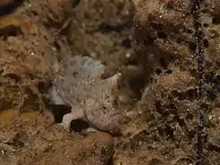Randall's frogfish has long, claw-like pectoral fins that it uses for stabilization. The colors range from black to white and yellow to brown. Unlike other frogfish, it has small white spots on its body. It often hides under rocks or among sea weed to ambush its prey.[1]