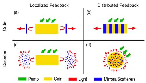 A random laser (RL) is a laser in which optical feedback is provided by scattering particles.[1] As in conventional lasers, a gain medium is required for optical amplification. However, opposite to Fabry–Pérot cavities and distributed feedback laser, neither reflective surfaces nor distributed periodic structures are used in RLs, as light is confined in an active region by diffusive elements that either can or cannot be spatially distributed inside the gain medium.