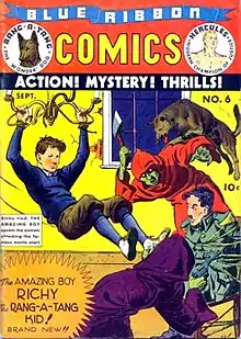 ![]() The cover of Blue Ribbon Comics #6 (Sept 1940), with Rang-a-Tang the Wonder Dog and Richy the Amazing Boy saving Charlie Chaplin from hooded Bundonian thugs | |