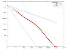 While Zipf's law works well in many cases, it tends to not fit the largest cities in many countries; one type of deviation is known as the King effect. A 2002 study found that Zipf's law was rejected in 53 of 73 countries, far more than would be expected based on random chance.[11] The study also found that variations of the Pareto exponent are better explained by political variables than by economic geography variables like proxies for economies of scale or transportation costs.[12] A 2004 study showed that Zipf's law did not work well for the five largest cities in six countries.[13] In the richer countries, the distribution was flatter than predicted. For instance, in the United States, although its largest city, New York City, has more than twice the population of second-place Los Angeles, the two cities' metropolitan areas (also the two largest in the country) are much closer in population. In metropolitan-area population, New York City is only 1.3 times larger than Los Angeles. In other countries, the largest city would dominate much more than expected. For instance, in the Democratic Republic of the Congo, the capital, Kinshasa, is more than eight times larger than the second-largest city, Lubumbashi. When considering the entire distribution of cities, including the smallest ones, the rank-size rule does not hold. Instead, the distribution is log-normal. This follows from Gibrat's law of proportionate growth.