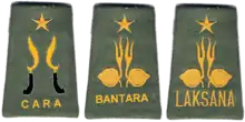 Penegak Laksana is a level after Penegak Bantara in Penegak age group. A Scout can earn this level after they fulfill requirements from the Penegak/Rover Handbook. One can be easily identified as Penegak Laksana by the shoulder loop on his/her uniform. The difference between the Bantara and Laksana shoulder loop is the word written on it. The color and sign is the same between Bantara and Laksana. In Penegak group, the only shoulder loop that looks different is the CARA (Calon Bantara) or Bantara Cadet, where the logo is not the Tunas Kelapa (coconut sprout), but the kujang, an Indonesian traditional weapon, from West Java), and the word written: CARA (Calon Bantara) or Bantara Cadet.