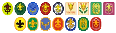 The rank program uses a series of medals and patches as emblems. The left-pocket badge oval shape and coloration is based on the rank badges used by the Boy Scouts of America between 1972 and 1990. The badge for the Apprentice or Scout rank consists of a simple fleur-de-lis, which symbolizes a compass needle. The needle points the Scout in the right direction, onward and upward.[4] This is the only badge to have a button loop, to emphasize its temporary status and that a Scout should soon move on to Tenderfoot. The next two ranks show the rank highlighted with the rest of the emblem subdued into the background. The Tenderfoot badge takes the fleur-de-lis of the Scout badge and incorporates the sacred mirror Yata no Kagami, which represents wisdom and honesty. The stars symbolize truth and knowledge. The Second Class badge features a scroll inscribed with the Scout Motto, with the ends turned up and a knotted rope hanging from the bottom. The knot reminds each Scout to remember the Scout slogan, Do a Good Turn Daily, and the upturned ends of the scroll symbolize cheerfulness in service.[5] The First Class badge combines the elements of the Tenderfoot and Second Class badges. The First Class badge is essentially the same as the emblem of the SAJ. Chrysanthemum has a First Class symbol on a stylized white chrysanthemum, the symbol of the Japanese Royal Family. Fuji Scout was originally the ultimate rank at the Scout level, and thus of Japanese Scouting itself, prior to the creation of Venture Scouting. Now it is the highest level in Venturing, still the highest youth rank overall.[6]