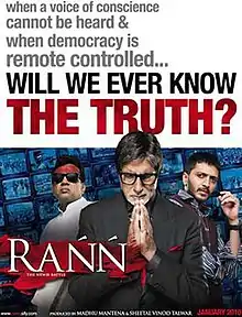 Rann (transl. Battle) is a 2010 Indian Hindi-language political thriller film written and directed by Ram Gopal Varma. The film stars Amitabh Bachchan, Sudeep, Riteish Deshmukh, Paresh Rawal, and Gul Panag.[1] The film was premiered at Toronto International Film Festival.[2][3]