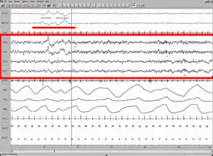Polysomnographic record of REM Sleep. EEG highlighted by red box. Eye movement highlighted by red line.