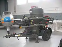 The original Rapier took the form of a two-wheeled launcher carrying four missiles, an optical tracker unit, a generator, and a trailer of reserve missiles. The launcher consists of a vertical cylindrical unit carrying two missiles on each side, the surveillance radar dish and "Identification Friend or Foe" (IFF) system under a radome on top, the guidance computer and radar electronics at the bottom, and a prominent parabolic antenna for sending guidance commands to the missiles on the front.[16]