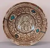 Raqqa ware or Rakka ware is a style of lustreware pottery that was a mainstay of the economy of Raqqa in northeastern Syria during the Ayyubid dynasty.[1] Though the ceramics were varied in character, they have been identified during the 20th century by on-site excavations that securely linked the highly sought-after surviving pieces to Raqqa.[2] However, Raqqa was not the only production site and Raqqa Ware has been found at various locations on the Euphrates, such as Qala'at Balis.[3] The pieces typically have a white body covered in siliceous glaze, with decorations in brown luster or blue and back underglaze.[1] The glazes most often vary in both transparency and shades of turquoise, however other colors were also used.[1] Raqqa ware typically consists of kitchen items such as jars, dishes, and bowls with basic shapes that served everyday purposes such as storage.[4] Some sculptural figures exist, and though their original purpose is debated, they are thought to be toys or decorations for the home.[4]