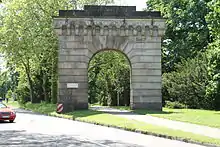 The construction of the fortress resulted in an enormous economic upturn for the town, which was later paid for however with the departure of public facilities such as the court (Hofgericht) and county council (Kreisregierung).[6] The Austrian lieutenant colonel, Georg Eberle was appointed as the senior fortress construction engineer and almost all the management staff were from Austria. The large number of construction workers employed (in 1844 4,000[7]) made the expansion of municipal infrastructure (police and medical services) necessary, the financing of which caused disputes between the town, the grand duchy and federal military authorities. The majority of the construction stone came from a roughly 500-metre-long bunter sandstone quarry on the hill of Eichelberg near Oberweier and was transported to Rastatt on a 14.5-kilometre-long, horse-drawn wagonway,[8] its capacity being 400 cubic metres per day. In the quarry 400-1200 workers were employed, for whom a special hutted camp was built. In addition to locals, there were workers from Württemberg, Austria, South Tyrol and Italy.[9] It was planned to complete the construction in 1849, but this did not come to fruition due to financial problems and the intervention of the Baden Revolution.