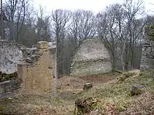 Rauheneck Castle (German: Burg Rauheneck) (usual spelling today Raueneck = "forested corner" or "hill spur") is a ruined administrative castle of the Bishopric of Würzburg in the Haßberge in the county of Haßberge, Lower Franconia, Bavaria (Germany). The site, which was badly in need of repair, was closed until 2006 due to the danger of collapse but has been accessible again since the start of, as yet unfinished, emergency repair work.