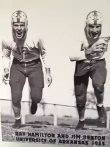 A member of the Arkansas Razorbacks 1930's All-Decade Team, he lettered in football in 1935, 1936, and 1937. In 1936, Hamilton played both sides of the ball playing a key role in defeating the Texas Longhorns 6-0 to win their first ever Southwest Conference Championship. He also lettered in basketball in 1936, 1937, and 1938.[2][3]