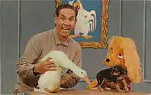 Starting in 1962, Rayner began hosting his own long-running Ray Rayner and His Friends, which had the title Breakfast With Bugs Bunny when he became its host; it was renamed in 1964.[17] The show featured old cartoons such as various Warner Brothers character cartoons, arts-and-crafts, which often ended up as a gluey mess, and animals such as Chelveston the Duck who was named after RAF Chelveston where Rayner was stationed during World War II. Chelveston occasionally bit and Rayner was notably wary. During these segments, Chelveston walked around the set, eat, or bathe while a then-current top 40 song was played.[10][17][21] Rayner later said he put duck feed in the cuffs of his coveralls so Chelveston nipped at them, then save himself from the duck by giving him a head of lettuce to pick apart.[4] What was not known to the public until after the program was no longer on the air was that Chelveston was actually played by four different ducks over the years.[8][22]