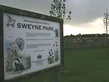 Sweyne Park is controlled by Rochford District Council. It is situated north of Sweyne Park School and can be accessed in several ways. The entrance in Downhall Park Way has a small car park, and there is a play area. It has another smaller entrance in Downhall Park Way, adjacent to Canterbury Close. It can also be accessed from Victoria Avenue. In 2008 an entrance was established from Priory Chase. The park has a pond.[37] It has a bridleway running round its perimeter of about 2 km (1.2 mi).