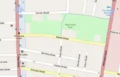 Raymond Park is roughly rectangular in shape and bounded by Main Street to the west, Wellington Street to the east, and Baines Street to the south, and Sinclair Street in part to the north. The irregularity in shape is due to the presence of the Pineapple Hotel in the south-west corner and housing at other locations, presumably existing prior to the establishment of the park. Note Baines Street is named after Edward Joseph Baines, a mayor of Brisbane who was the publican of the Pineapple Hotel.