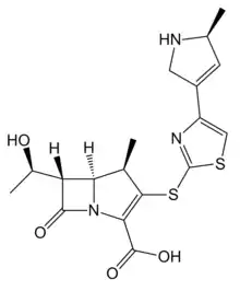 Razupenem (PTZ-601) is a broad spectrum injectable antibiotic, from the carbapenem subgroup of beta-lactam antibiotics. It was developed as a replacement drug to combat bacteria that had acquired antibiotic resistance to commonly used antibiotics.[1] Razupenem performed well against a variety of bacterial strains,[2] but further development is in doubt due to a high rate of side effects in Phase II clinical trials.