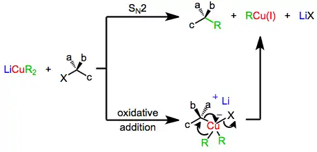 The mechanism of nucleophilic substitution by lower-order organocuprates depends in a profound way on the structure of the substrate, organocuprate, and reaction conditions. Early evidence suggested that a direct SN2 displacement was occurring;[6] however more recent results suggest that invertive oxidative addition of copper(I) into the carbon-leaving group bond takes place, generating a copper(III) intermediate which then undergoes reductive elimination to generate the coupled product.[7] Both of these mechanisms predict inversion at the electrophilic carbon, which is observed in a number of cases.[8] On the other hand, experiments with radical traps and the observation of racemization during substitution suggest a radical mechanism.[9]