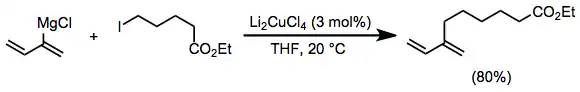Vinyl and aryl Grignard reagents couple with primary alkyl halides in the presence of a catalytic amount of a copper(I) halide salt. The use of Li2CuCl4 rather than simple copper(I) halide salts (CuX) improves yields of these coupling reactions.[15]