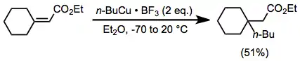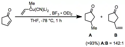 Conjugate addition reactions of higher-order cyanocuprates represent another useful application for boron trifluoride etherate. The vinyl group is transferred selectively in this reaction (there is a mistake in a scheme); this is in contrast to substitution reactions employing the same reagent, which result in selective transfer of the methyl group.[24]