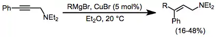 The addition of Grignard reagents to alkynes is facilitated by a catalytic amount of copper halide. Transmetalation to copper and carbocupration are followed by transmetalation of the product alkene back to magnesium. The addition is syn unless a coordinating group is nearby in the substrate, in which case the addition becomes anti and yields improve.[16]