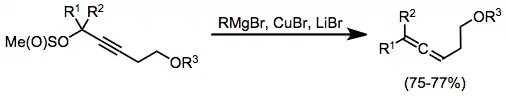 Propargyl methanesulfinates are useful substrates for the synthesis of allenes from stoichiometric organocopper complexes. In this case, the complexes were generated in situ through the combination of a Grignard reagent, copper(I) bromide, and lithium bromide. Organocopper complexes very often need Lewis acid activation in order to react efficiently; magnesium bromide generated in situ serves as an activating Lewis acid in this case.[17]