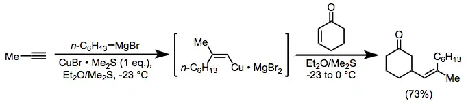 Alkenylcopper complexes, easily generated through carbocupration, are useful for the introduction of a vinyl group in the β position of a carbonyl compound. In this case, as above, magnesium bromide is serving as an activating Lewis acid.[18]