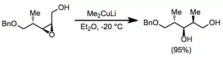Epoxide opening with organocuprates is highly selective for the less hindered position. Substitution takes place with complete inversion of configuration at the electrophilic carbon.[19]