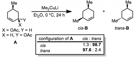 Generally, organocuprates react with allylic electrophiles in an anti SN2 fashion. In the reaction below, nearly complete inversion of configuration was observed despite the presence of a second stereocenter in the ring.[20]
