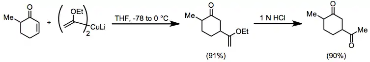 Conjugate addition of organocuprates is widely used in organic synthesis. Vinyl ether cuprates serve as convenient acyl anion equivalents in conjugate addition reactions to enones. The resulting enol ethers can be hydrolyzed to 1,4-diketones, which are difficult to access using conventional carbonyl chemistry.[21]