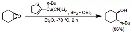 Boron trifluoride etherate is also useful as an additive in reactions of higher-order cyanocuprates. The use of the 2-thienyl group as a "dummy" substituent in the cyanocuprate conserves the potentially valuable organolithium reagent used to generate the cyanocuprate (as only the dummy group is present in copper-containing byproducts). In the absence of boron trifluoride etherate, no reaction was observed in this case.[23]