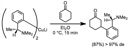 Diastereoselective conjugate addition reactions of chiral organocuprates provide β-functionalized ketones in high yield and diastereoselectivity. A disadvantage of these reactions is the requirement of a full equivalent of enantiopure starting material.[13]