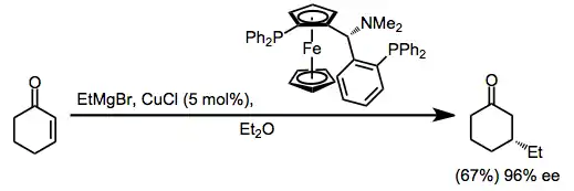 More recently, catalytic enantioselective methods have been developed based on the copper(I)-catalyzed conjugate addition of Grignard reactions to enones. The proposed mechanism involves transmetalation from the Grignard reagent to copper, conjugate addition, and rate-determining reductive elimination (see the analogous upper pathway in equation (2)).[14]