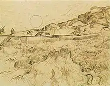 In late September 1889, Van Gogh painted reduced versions of several of his earlier works, including a replica of the Reaper similar to the one he made earlier that month, smaller versions of Wheat Field with Cypresses and Bedroom in Arles, and what he called "a little portrait of me", Self-Portrait Without Beard.[2][20] In particular, he wrote on 6 September 1889: "I really want to redo the reaper one more time for Mother, if not I'll make her another painting for her birthday".[12][21] This third version of the painting, also known as The Wheatfield behind Saint Paul's Hospital with a Reaper, or La moisson, 'the harvest',[22] was smaller at 59.5 cm × 72.5 cm (23.4 in × 28.5 in).[2][23] The painting was completed and drying by 28 September[12] and, in December 1889, was sent to Theo along with several other small replicas.[3]