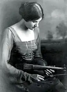At Stanford's urging she shifted her focus from the violin to the viola, just as the latter was coming to be seen as a legitimate solo instrument.[1] She studied with Lionel Tertis, who was considered by some the greatest violist of the day.[1] In 1910 she composed a setting of Chinese poetry, called "Tears", in collaboration with a group of fellow students at RCM.[2] She also sang under the direction of Ralph Vaughan Williams in a student ensemble organised by Clarke to study and perform Palestrina's music.[2]