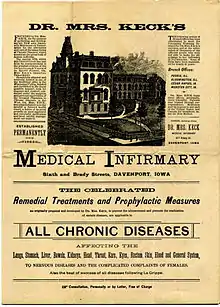 Mrs. Dr. Keck moved her family to Davenport, Iowa, on the Mississippi River, in 1875 as her business expanded.[9] As was common for Midwestern women physicians in her day, she used both Dr & Mrs so that her married and professional status could both be understood by the public. She only treated chronic conditions and according to the testimonial letters she published in her advertising, the majority of her customers were working people and farm families who could not afford the high cost of private doctors' fees and who received her medical remedies and treatment advice by mail order.