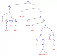 As we can see in the X-bar theory tree diagram of (6b), the reciprocal pronoun is in the subject position of the embedded clause, which is introduced by complementizer "that". It is not possible for a reflexive pronoun to occur in this position as shown by the ungrammaticality of (6a).