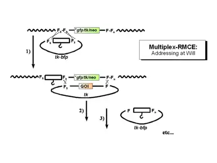 RMCE (recombinase-mediated cassette exchange) is a procedure in reverse genetics allowing the systematic, repeated modification of higher eukaryotic genomes by targeted integration, based on the features of site-specific recombination processes (SSRs). For RMCE, this is achieved by the clean exchange of a preexisting gene cassette for an analogous cassette carrying the "gene of interest" (GOI).