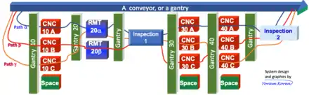 The system is composed of stages: 10, 20, 30, 40, etc. Each stage consists of identical machines, such as CNC milling machines, or RMT machines. The system produces one product, for example, an automotive engine block or a cylinder head. The manufactured product moves on the horizontal conveyor. Then Gantry-10 grips the product and brings it to one of CNC-10. When CNC-10 finishes the processing, Gantry-10 moves it back to the conveyor. The conveyor moves the product to Gantry-20, which grips the product and load it on the RMT-20, and so on. Inspection machines are placed at several stages, and at the end of the manufacturing system.
