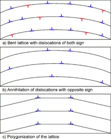 Each dislocation is associated with a strain field which contributes some small but finite amount to the materials stored energy. When the temperature is increased - typically below one-third of the absolute melting point - dislocations become mobile and are able to glide, cross-slip and climb. If two dislocations of opposite sign meet then they effectively cancel out and their contribution to the stored energy is removed. When annihilation is complete then only excess dislocation of one kind will remain.